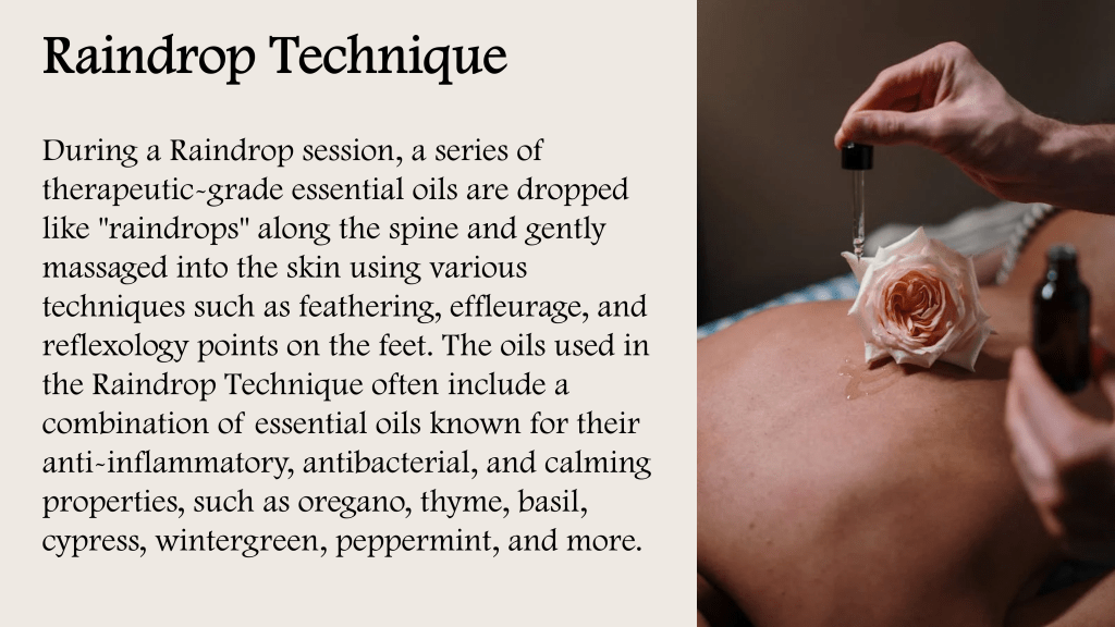 “Raindrop Therapy is a method that combines reflexology, aromatherapy, massage and therapeutic essential oils that are applied to the spine and feet. This technique has been designed to help bring balance to the body with its relaxing and mild application”.