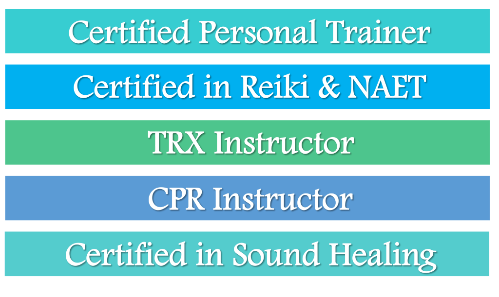 I am also very passionate about Holistic Health. For many years I have been learning and searching for more tools in order to help others access their own inner healing abilities. I received certifications in various alternative techniques, including; NAET (Nambudripad Allergy Elimination Technique), Raindrop Technique, Reiki, Metamorphic Technique, Sound Healing. In addition, I recently received certification as a Qigong Group Leader, Yin Yoga Instructor and Assisted Stretching Specialist.